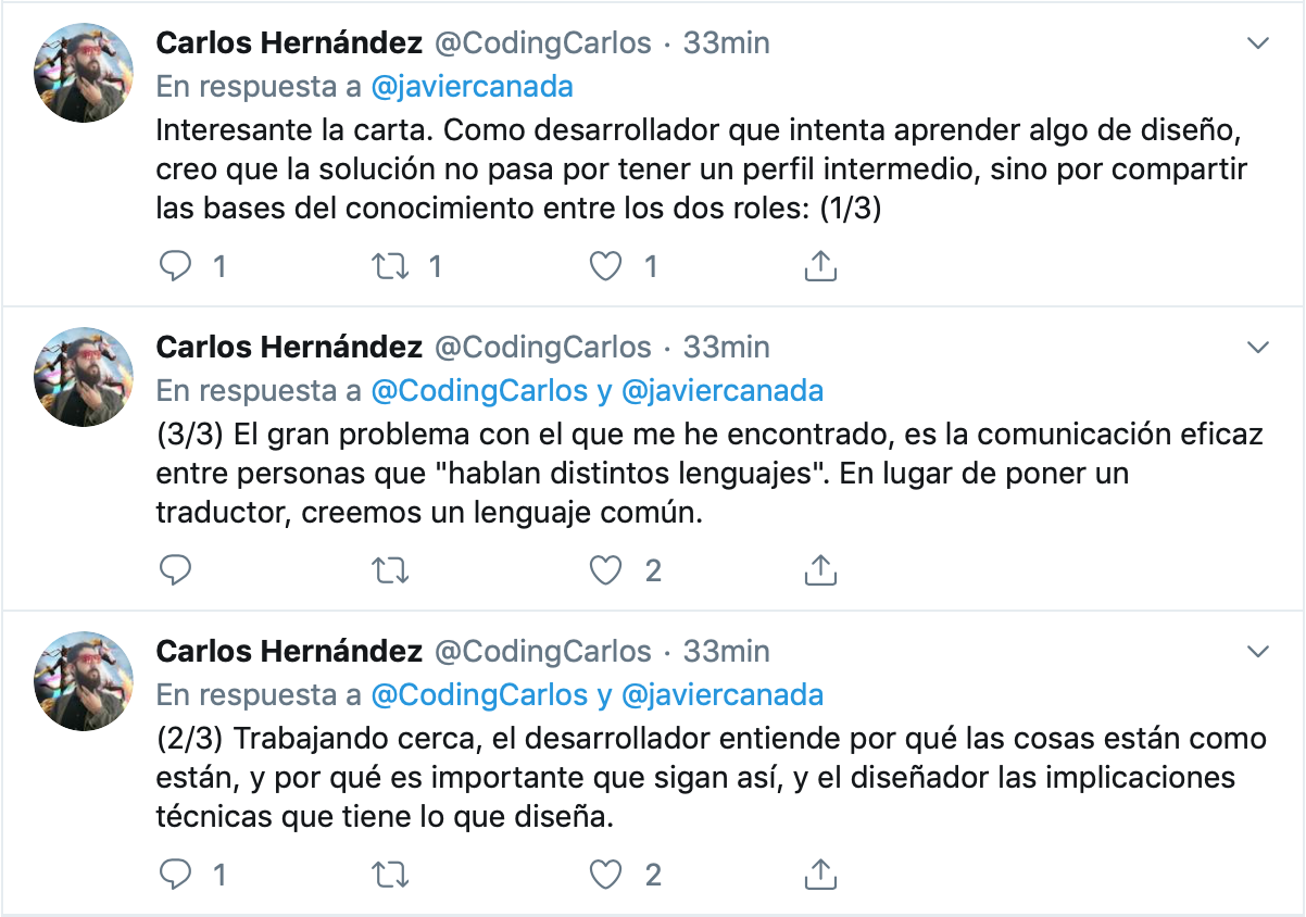 El comentario más generalizado ha sido que no habría que crear un rol específico, que se trata de que la persona de diseño y la de desarrollo hablen más, que haya diálogo y estén ambos involucrados desde el principio. Este hilo de Carlos Hernández ilustra bastante bien algunas de las reacciones: